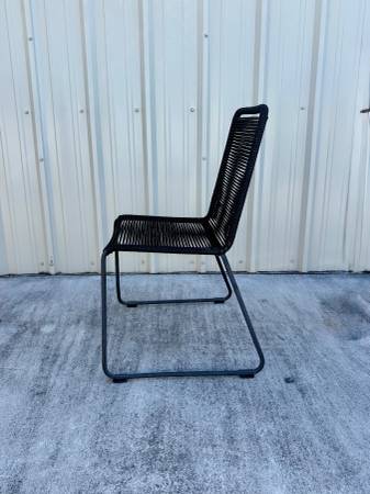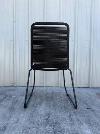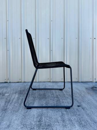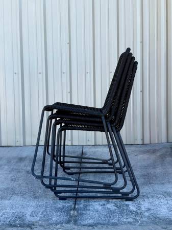 Set of four Theresa Stacking Patio Dining Side Chairs in black, purchased through AllModern/Wayfair. These are modern, lightweight indoor/outdoor chairs with a flexible cord-style seat and a sturdy powder-coated steel sled base. They’re comfortable, weather-resistant, easy to clean, and stack compactly for storage.